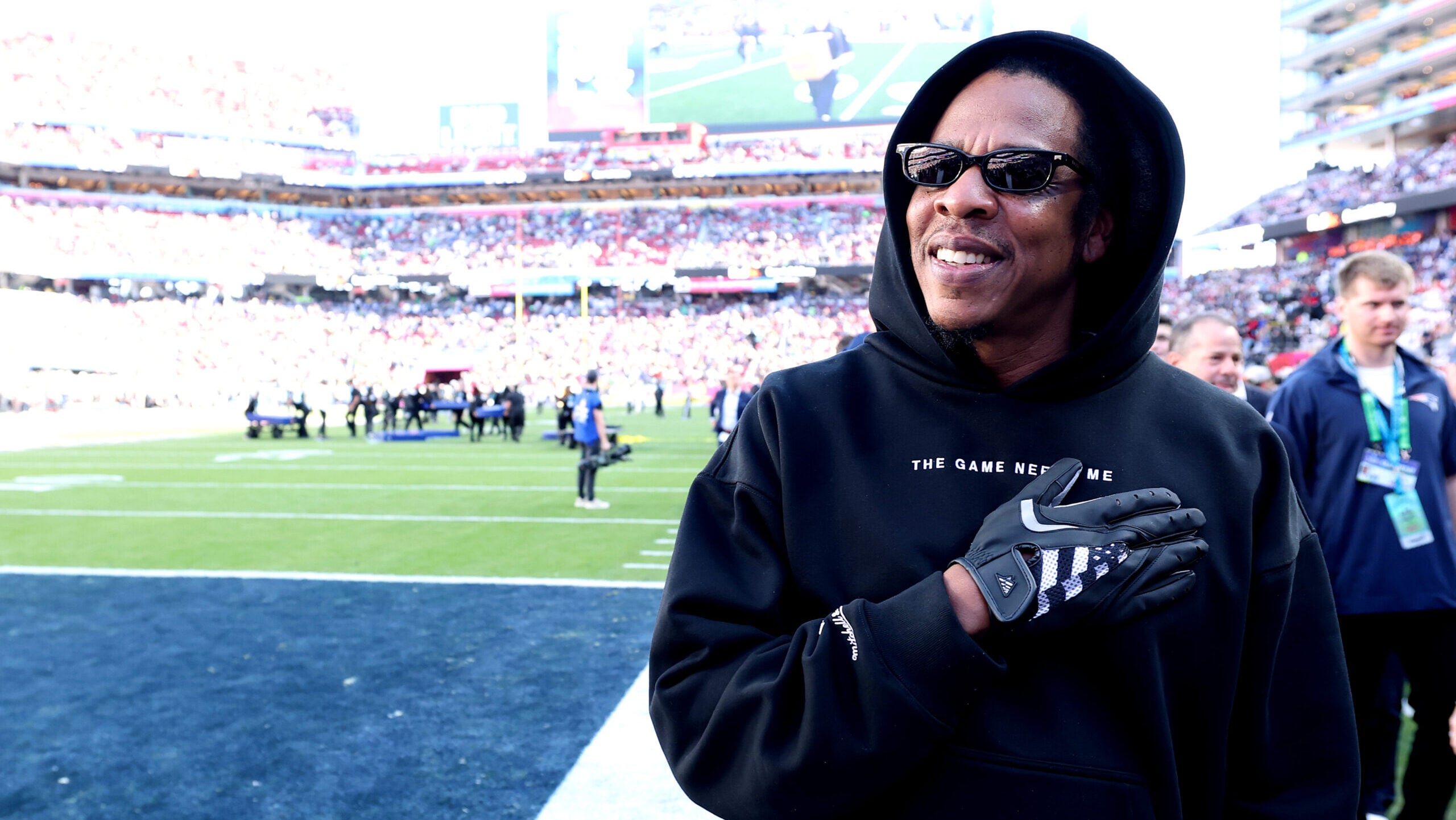 Jay-Z looks on prior to the start of Super Bowl LX between the Seattle Seahawks and the New England Patriots at Levi’s …