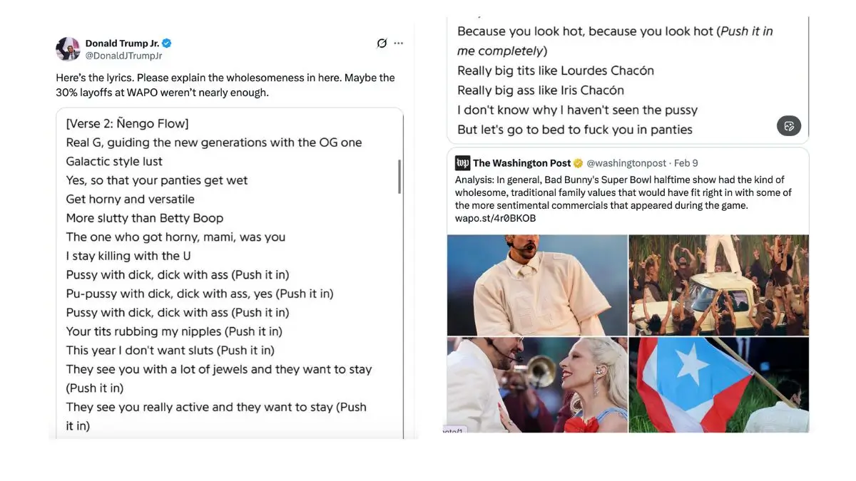 The post appeared to challenge how the performance was being remembered. The verse Don Jr. highlighted was not part of the Super Bowl halftime show. The explicit lines he shared belong to Ñengo Flow’s verse in the studio version of “Safaera,” not the portion performed by Bad Bunny during the Super Bowl broadcast.