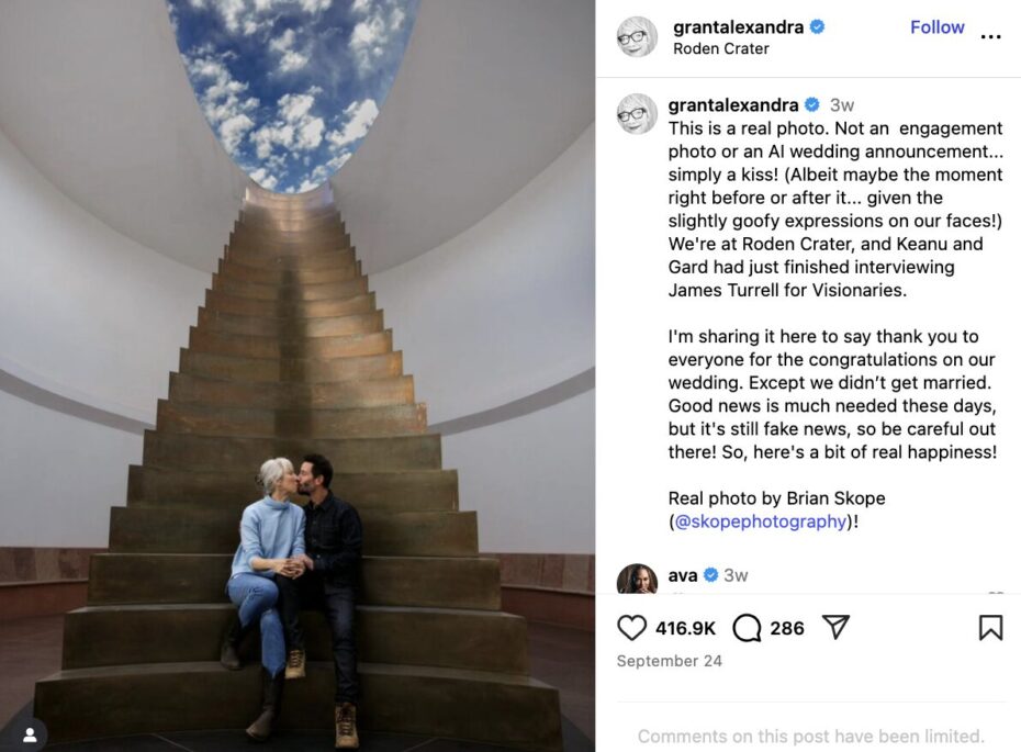 Rumors spread that the duo had married earlier in 2025. Grant dispelled the chatter on Instagram back in September. She posted a picture of the couple kissing and wrote in part, “Not an engagement photo or an AI wedding announcement… simply a kiss! … I’m sharing it here to say thank you to everyone for the congratulations on our wedding. Except we didn’t get married. … fake news.”